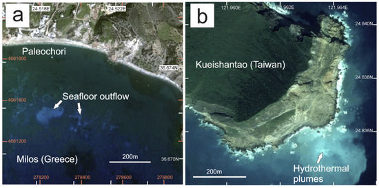 Satellite imagery of SHT vents. (a) Seafloor outflow observed in Milos associated with HT activities; (b) high turbidity HT plumes observed in Kueishan Tao [66].