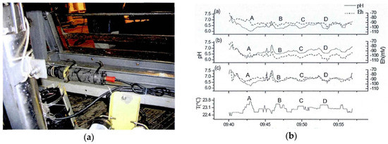 The IrO2 electrode applied in SHT studies in Kueishan Tao HT vent areas. (a) The integrated sensors; (b) pH and temperature measured in the HT plume of a yellow vent. The three pH curves refer to the pH measured at depths of 3, 5 and 7 m, respectively. The letters A, B, C and D mark the variation cycle of the temperature. When the temperature rises, the values of pH and Eh drop, indicating that the area is under the influence of HT fluids [68].