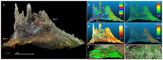 South side of reconstructed 3D textured dense point cloud and derived terrain variables [74]. (B) shows the aspect of chimney; colors on (C) show the different roughness; (D) shows the inclination of slope, with a maximum value of 90 degrees. (E) shows the Gaussian surface curvature. (F,G) are detailed views of box 1 and box 2 in figure (A), respectively.