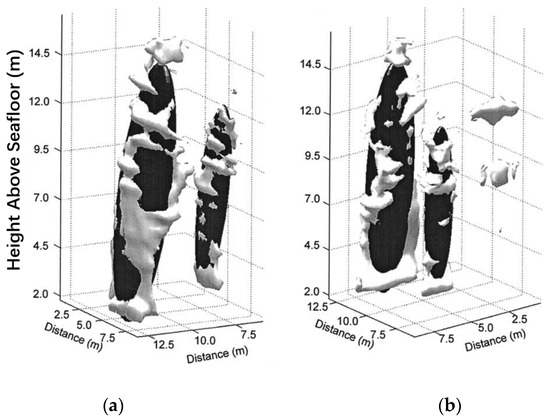 Although photogrammetry provides us with abundant information on plume appearance, terrain signature and biological distribution, some invisible features, such as temperature and flow velocity, cannot be obtained. Besides, the high turbidity of water around HT vents often exerts a negative influence on photo quality. Thus, approaches based on acoustic methods were raised. Rona and his colleagues were among the earliest to research HT vents using acoustic methods [75,76,77]. During the dive in November 1990, they scanned an HT plume in arcuate sectors at increasing angular increments from the vent orifices up to 90° using a sonar system mounted on the submersible. Using the data collected, the 3D structure of the HT plume with a height of up to 100 m above the seafloor was successfully reconstructed (Figure 10).