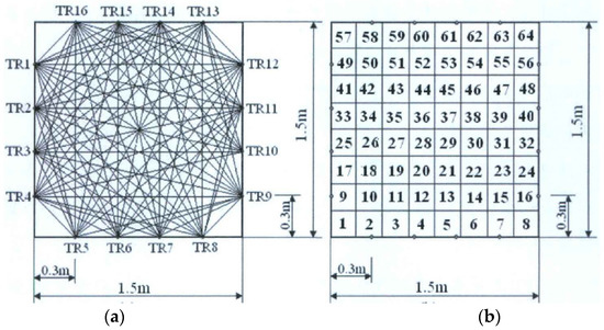 The reconstruction of 2D temperature field using acoustic tomography. (a) The distribution of hydrophones and corresponding acoustic paths on the measuring plane; (b) the meshed plane for the reconstruction of 2D temperature distribution using the total least-squares method [72].