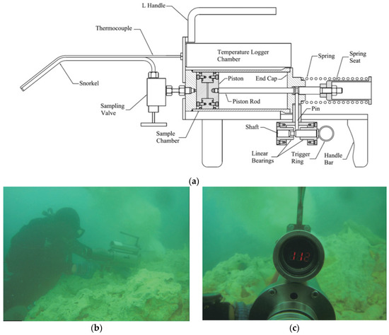 Wu and his colleagues developed a handheld sampler for collecting organic samples from SHT vents (Figure 13a) [82]. The sampler utilizes a syringe-like sampling bottle made of titanium to collect organic samples. The bottle was sealed with a Teflon fluorinated ethylene propylene encapsulated O-ring to achieve perfect gas-tight performance. Two major improvements were made to ensure its performance in SHT sampling. First, a temperature logger was integrated into the sampler, which measures the temperature at the inlet of the snorkel using a thermocouple and displays the result on an LED display in real-time. The reading displayed by a red LED half hidden in a titanium housing can be clearly recognized even in high turbidity waters (Figure 12c). The real-time temperature measurement helps the diver to find the point with the highest temperature in the HT plume where the mixing of HT fluid and surrounding seawater were believed to be the weakest [83]. This feature helps in improving the purity of the HT samples collected. Second, an orifice or an annular gap between the piston rod and the end cap was used to regulate the flow rate of the sampler. A properly regulated flow rate will balance the purity of samples with the sampling efficiency. The sampler was tested in the Kueishan Tao HT vent field. The comparative test based on DOC concentration and salinity analysis shows that water samples with higher purity compared with glass-bottle-collected samples were successfully obtained.