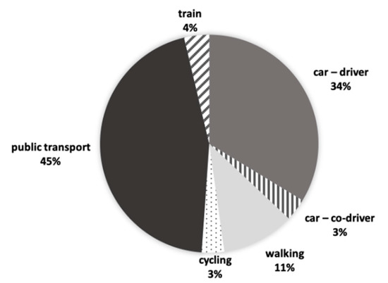 Figure 2 demonstrates the primary type of transport used by survey respondents. It shows that public transport is used by the majority of the respondents as the primary means of transport (45%, n = 122). The second group is composed of car-drivers who use a car as their primary means of transport (34%, n = 91), and co-drivers (3%, n = 9), who also belong into this group. The non-motorised means of transport such as cycling (3%, n = 9) and walking (11%, n = 29) are the third most common way of transport in Frýdek-Místek according to the respondents. Trains (4%, n = 10) were chosen by those respondents who do not live in the Frýdek-Místek and for whom commuting by train is more convenient than by bus, and this means of transport could be labelled as the least important for the respondents. The results show that the service of public transport in Frýdek-Místek plays an important role in the transport system and more detailed look into data (Figure 3 and Figure 4) confirms that such a trend is an outcome of the FFPT implementation, as documented in [16].