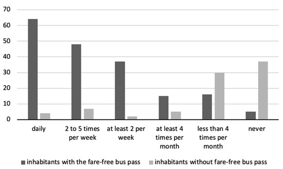 The implementation of the FFPT policy, as mentioned above, resulted in a ridership increase as it attracts new users and generates new travels. From Figure 4, it is possible to see that those who own the free-bus pass use public transport more frequently than those who do not. In Table 1, it is possible to see the composition of respondents with/without the fare-free bus pass according to the primary means of transport used by the survey respondents. Unsurprisingly, the majority of the respondents with the fare-free bus pass are the public transport users (n = 108) followed by car-drivers (n = 38) as the second biggest group, with the other means of transport being in the minority (see Table 1). From those who do not own the fare-free bus pass, the car-drivers (n = 53) are the largest group and public transport users (n = 15) are the second biggest group, followed by the other means of transport (see Table 1). In general, the residents with the fare-free bus pass prevail in the survey. As is indicated by the respondents, new travels are generated because those respondents who possess the fare-free bus pass are using public transport mainly to travel on short distances (up to 3 stops). Also, the new travels are partly generated by the substitution of walking and cycling by public transport (Figure 3). The substitution of walking and cycling together with using public transport more frequently demonstrates the new travels generated by the FFPT policy. As the fare-free public transport zones also cover rural and touristic hinterland of Frýdek-Místek, some respondents claim that they are using public transport to reach the places connected with the leisure activities. However, this type of travels is limited due to the availability and frequency of public transport connections.