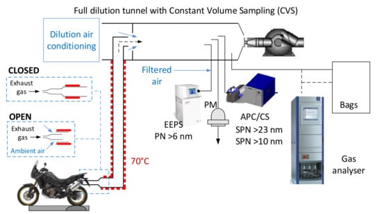 This study examined the emissions of a 1 L Euro 4 motorcycle with two drivers and two configurations (open and closed). The first driver was more experienced in chassis driving and practiced the cycle before the official tests, while the second did not. In the closed configuration, the whole exhaust gas was transferred to the full dilution tunnel via a 4 m tube heated at 80 °C. In the open configuration, ambient air was mixed with the exhaust gas at the tailpipe (dilution ratios around 2–4:1) and the diluted exhaust was transferred to the dilution tunnel. This resulted in lower exhaust gas temperatures in the transfer line.