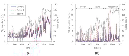 Figure 2 presents real-time examples of the gaseous pollutants with the two drivers. Most CO2 was emitted during the motorway driving (last part of the cycle). Similarly, for NOx, at the high-speed part NOx emissions were high, with a significant contribution from the transients. CO and THC had high emissions during cold start and at the last part of the cycle. In general, there is good agreement of the two drivers for CO2, while for CO and THC (total hydrocarbons) driver 2 generated higher spikes during cold start. For NOx, driver 2 generated more spikes during the whole cycle.