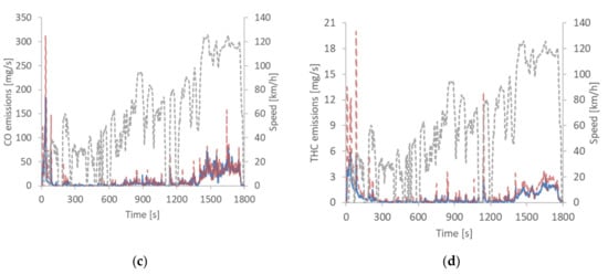 Real-time emissions of the gaseous pollutants with the two drivers (Driver 1: blue line, Driver 2 red dashed line): (a) CO2; (b) NOx; (c) CO; (d) THC (total hydrocarbons). The speed profile is also plotted with grey dotted lines.