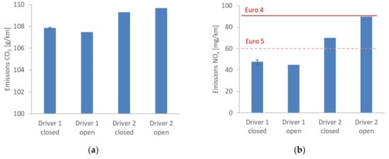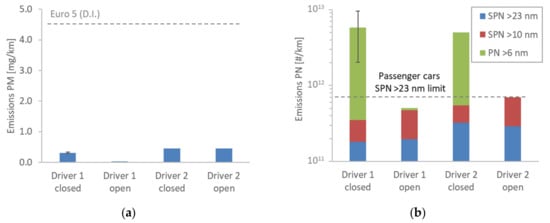 Figure 4 summarizes the particulate emissions. The PM mass was lower than 0.5 mg/km (Figure 4a); almost 10 times lower than the future Euro 5 limit for diesel and gasoline direct injection engines. For driver 1 (open configuration), the PM mass was almost 0 mg/km (only 7 μg the filter weight increase). These low levels were close to the background levels of the facility. For this reason, no differences could be seen between drivers or configurations. The SPN > 23 nm emissions were 2–3 × 1011 p/km; less than half of the passenger cars’ SPN > 23 nm limit. The SPN > 10 nm levels were double, reaching 6 × 1011 p/km. The GMD (geometric mean diameter) as determined by the EEPS was 15.5 to 17.5 nm (open configuration) justifying the high sub-23 nm particle concentration. The SPN emissions of driver 1 were lower than those of the second driver. The closed and open configurations were similar for SPN > 23 nm, but the SPN > 10 nm was lower with the closed configuration compared to the open. The PN > 6 nm were at the SPN > 10 nm levels for the open configuration but more than one order of magnitude higher with the closed.
