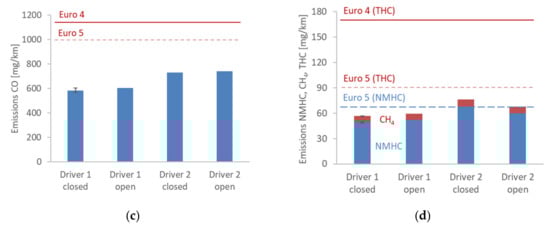 Cycle emissions of the gaseous pollutants with the two drivers and configurations: (a) CO2; (b) NOx; (c) CO; (d) THC (total hydrocarbons), NMHC (non-methane hydrocarbons), CH4 (methane). The applicable Euro 4 limits are given with the red continuous lines, while the future Euro 5 with dashed lines.