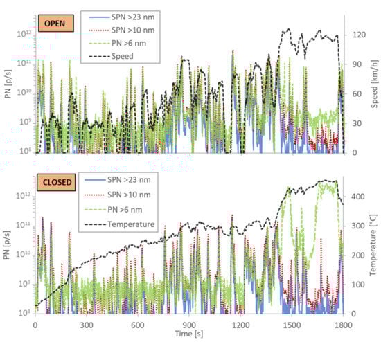 Figure 5 plots the real-time SPN emissions above 23 and 10 nm, along with the PN emissions above 6 nm. Most particles were produced during accelerations. The cold start emissions were not particularly high, compared to the rest of the cycle. The closed configuration had lower concentrations, except at the high-speed part with the EEPS measuring PN > 6 nm. The concentrations increased by orders of magnitudes when the exhaust gas temperature exceeded 300 °C.