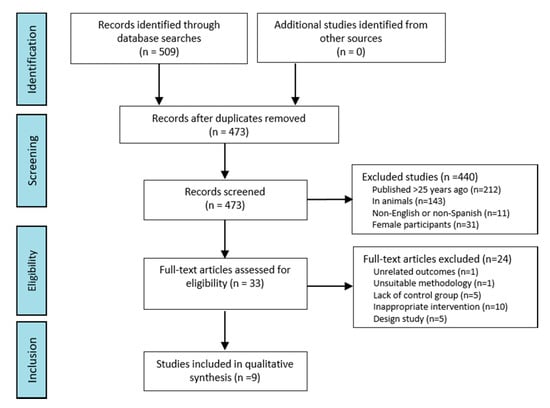 We identified an initial total of 509 records. Among those, we removed 36 duplicates, 212 manuscripts published more than 25 years ago, 143 articles conducted on animals, 11 additional non-Spanish or non-English studies, and 31 records that included female participants. We also excluded 24 articles after full-text review. Reasons for exclusions after full-text review were unrelated outcomes (n = 1), unsuitable methodology (n = 1), lack of control group (n = 5), inappropriate intervention (n = 10), and study design (n = 5). The remaining nine [,,,,,,,,] studies met our inclusion criteria and were included in the present systematic review (Figure 1).