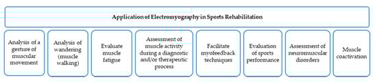Co-activation also involves simultaneous activity in agonist and antagonist muscles []. This is very important when assessing the quality of movement because alterations in coercion are related to immaturity of the neuromuscular system []. Furthermore, it is possible to evaluate fatigue with EMG by studying its evolution and potentially providing a solution with an appropriate treatment []. This is of special interest for sports and occupational medicine because it could improve sports performance and productivity []. EMG facilitates myofeedback techniques that are widely used in physiotherapy with the aim of postural re-education and proprioception work []. EMG gives the opportunity to assess muscle activity during a diagnostic and/or therapeutic process in sports medicine. Moreover, it analyzes muscular activation, which allows for the comparison of healthy and pathological states. Lastly, EMG provides information about muscular coordination and the relationship between agonist and antagonist muscles [].