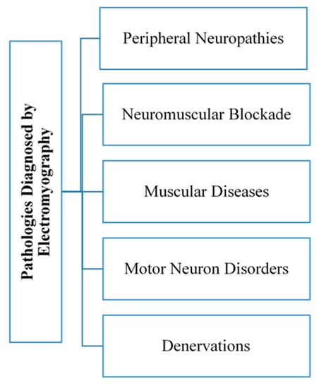 EMG has multiple applications, not least as a diagnostic tool. In some cases, patients are diagnosed after the onset of the first symptoms that follow a lengthy preclinical phase. Delayed diagnosis may cause health problems and notably reduce the quality of life. In this context, EMG provides a relatively simple and accessible diagnosis, one that yields information about the state of the peripheral nerves and muscles. EMG may also be useful in the early diagnosis of neuromuscular disease, distinguishing the specific type(s) of pathology and its effect on the axons or the nerve myelin. In other words, EMG may act as a record of muscle electrical activity; therefore, it constitutes an extension of physical examination that can evaluate the integrity of the motor system [,,,].