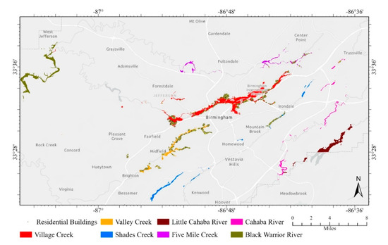 One-hundred-year floodplain areas in Birmingham, AL, USA (FEMA, 2020) [55].