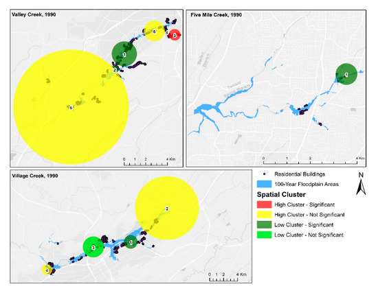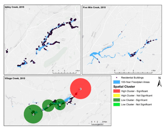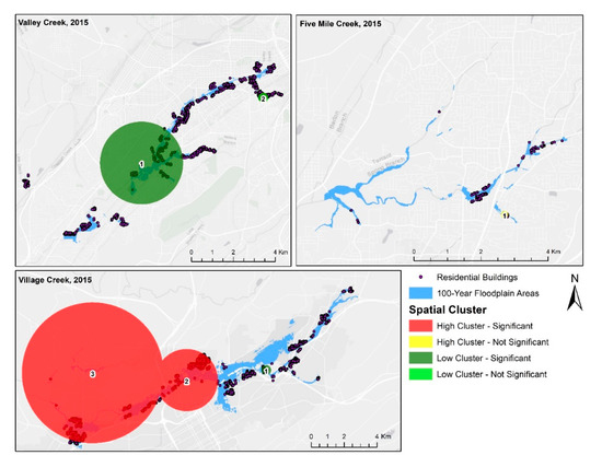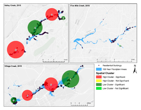 The spatial cluster analysis findings are different for Five Mile Creek areas compared to Village Creek and Valley Creek areas. In the Five Mile Creek area, the most likely cluster of children and elderly populations is the statistically significant low and high clusters in 1990 and 2010, respectively (Table A5 and Table A11). For 2000 and 2015, the result indicates that the most likely spatial cluster of children and elderly populations is low and statistically insignificant (Table A8 and Table A14). The high spatial cluster was located on the eastern side of the Five Mile Creek in 2010 (Figure A2). The percentage of the population and number of residential buildings in the high cluster area in the Five Mile Creek area in 2010 is 7.62 and 16, respectively (Table A2). However, the result indicates that there was no significant spatial cluster in 2015, which suggests that the children and elderly are moving away from the floodplain areas of Five Mile Creek.