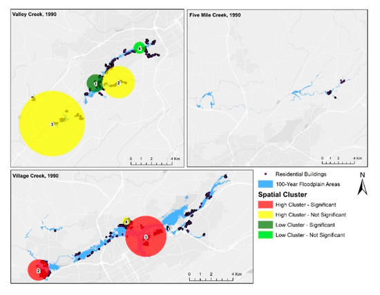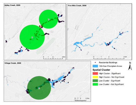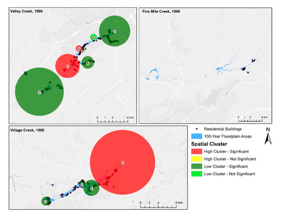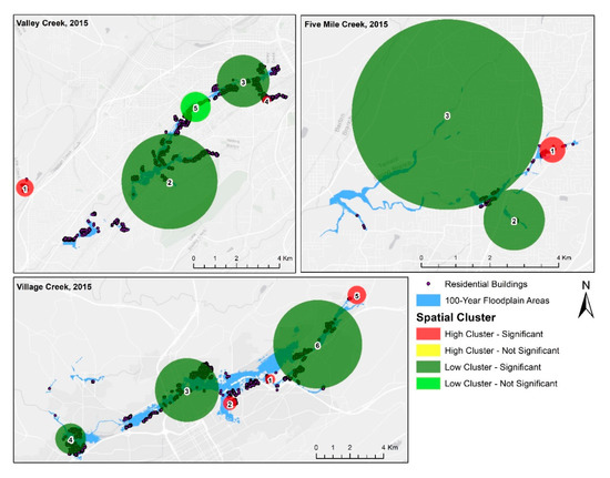 In Valley Creek areas, all most likely clusters were identified as statistically significant low clusters from 1990 to 2015 (Table A4, Table A7, Table A10 and Table A13). The locations of all these clusters are very similar, and they are in the north-east of Valley Creek (Figure 2 and Figure 3, Figure A1 and Figure A2). However, some significant high clusters exist in the Valley Creek area for children and the elderly population, but they are not most likely clusters. The percentages of the children and elderly population located within the spatial significant high clusters in Valley Creek in 1990, 2000, 2010, and 2015 are approximately 9.79, 10.80, 8.77, and 10.77, respectively (Table 2 and Table 3, Table A1 and Table A2). This finding suggests that the aggregation of children and the elderly population in floodplain areas of Valley Creek remains the same over time. In addition, the percentages of the children and elderly population that are highly clustered are much higher compared to significant low cluster areas. The number of residential buildings that are significantly highly clustered in the Valley Creek area in 1990, 2000, 2010, and 2015 is 105, 469, 341, and 540, respectively (Table 2 and Table 3, Table A1 and Table A2).