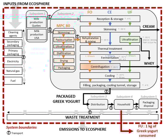 A global transformation of the food system is urgently needed to support environmental sustainability and feed a growing population. As stated by the EAT-Lancet Commission on Food, Planet, Health, this transformation calls for a shift towards healthy diets, improved food processes and food production efficiency, and at least a 50% decrease in food losses and waste (LW) to keep humanity in a safe operating space [1]. Meat and dairy products are widely recognized as major sources of environmental and/or health burdens [2], but this statement should be qualified relative to other products. For instance, some distinguish yogurt as a sustainable food for its health benefits and low environmental impact as compared to other animal source foods. Indeed, regular yogurt production emits 75 to 55% less greenhouse gas (GHG) emissions than cheese and is a good source of calcium and protein with a lot less fat [3]. Around the world, yogurts come in various types and compositions [4]. Greek yogurt (GY), also known as Greek-style yogurt, has flooded the North American market. In the past decade, it grew from 1% market share to around 40% in the USA [5] and 20% in Canada [6]. This spectacular success is likely attributed to GY’s nutritional and sensory properties. The high-protein content provides a thick and creamy texture [7], positioning GY and positioned it as a healthy food product that provides consumers with both pleasure and nutritional benefits [8]. However, from a sustainable diet perspective, the environmental impacts of GY should also be considered. GY is recognized as a source of incremental environmental impacts in the dairy sector. Indeed, its high-protein content is generally obtained by concentrating fermented milk through centrifugation to increase the yogurt’s protein content from 3.27% up to 10% w/w. This operation requires up to three times more milk input than regular yogurt and generates at least twice the weight of GY in acid whey [9,10]. Acid whey may be harmful to ecosystems if not recovered or disposed of correctly due to its acid pH (4.21–4.48) and high organic load (Biochemical Oxygen Demand (BOD): 45.8–50.4 mg/g) [11]. The increasing volumes of acid whey generate new operational challenges for dairy manufacturers [11]. Significant efforts have been invested to recover acid whey components. The American Chemical Society registered 3 500 patents in 2017, with most focusing on extracting proteins and lactose from GY acid whey using membrane-based filtration processes [12,13,14,15] or enzyme-based approaches [16]. However, most of these processes are not yet economically viable [5]. Therefore, instead of focusing on whey recovery, recent works have targeted processing innovation to reduce or eliminate the production of acid whey. The various technology alternatives explored are extensively described in a literature review conducted by Jørgensen et al. [8] and summarized in the supplementary materials (SM) of this paper (Section S1). These technologies influence the volume and composition of co-product generated, as well as GY composition and its sensory properties [7,17,18]. They also vary in terms of production yields, resources, utilities consumption such as energy, water use, chemicals at the manufacturing plant and capital costs of the processing equipment [8,18,19]. The technical benefits and drawbacks of each technological option are well documented but, to the best of our knowledge, no study has included a systematic environmental comparison of GY production systems and technologies.
