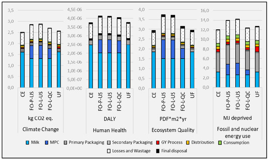 Milk production at the farm (including milk ingredients for FO) contributes to 82 to 88% of the climate change (CC), human health (HH), and ecosystem quality (EQ) impacts and to 33 to 43% of the fossil energy use (FEU) impacts for the five production alternatives before LW. This is consistent with the IDF report (2009) [42], which states that milk production contributes to 80 to 95% of the total LCA GHG emissions based on 60 dairy products studies. When LW is included, the main contributors are still milk and dairy ingredients, which contribute to 63 to 67% of the CC, HH, and EQ impacts and 25 to 35% of the FEU impacts.