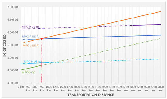 Variation in CC impact as a function of the transportation distance from MPC plant to GY plant for the three MPC sourcing alternatives scaled to the FU (1 kg of GY): MPC-P-US-A: 0.03 kg MPC 80 powder from USA with USA raw milk average; 0.12 kg MPC-L-US -A: liquid MPC from USA with USA raw milk average; 0.03 kg MPC-P-US -R1: MPC 80 powder from north east USA; 0.03 kg MPC-P-US -R5 MPC 80 powder from west coast USA; 0.12 kg MPC-L-Qc: liquid MPC from Québec.