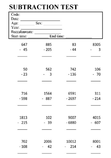 The students independently and anonymously answered the 20-subtraction questionnaire, in their normal classroom and in the presence of their normal professor and one of the authors of this article, in order to check that the data were collected in an adequate way. There was no time limit, although the time spent completing the questionnaire was recorded in each case. It was estimated that the questionnaire would take between 2 and 5 min, and 10 min at most. All students consented to the data they provided being taken into account for this research.