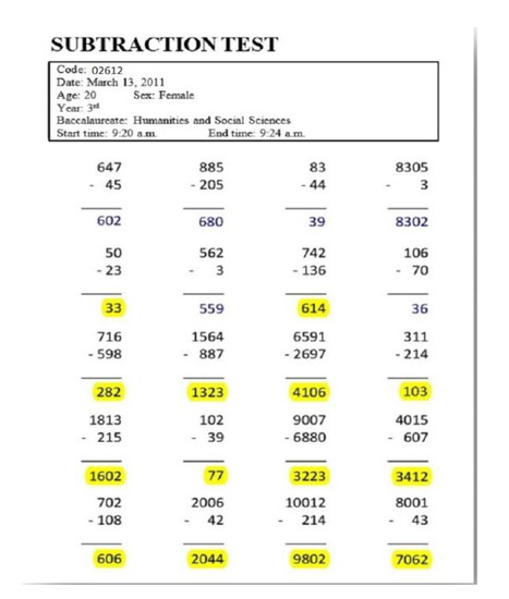Only 24.1% of the students correctly answered all 20 subtractions, meaning that 75.9% made at least one error. Combining the students who correctly completed the entire questionnaire with those who made a single error produces a percentage of 46.54%, meaning that over half of the students gave wrong answers for at least two of the 20 subtractions.