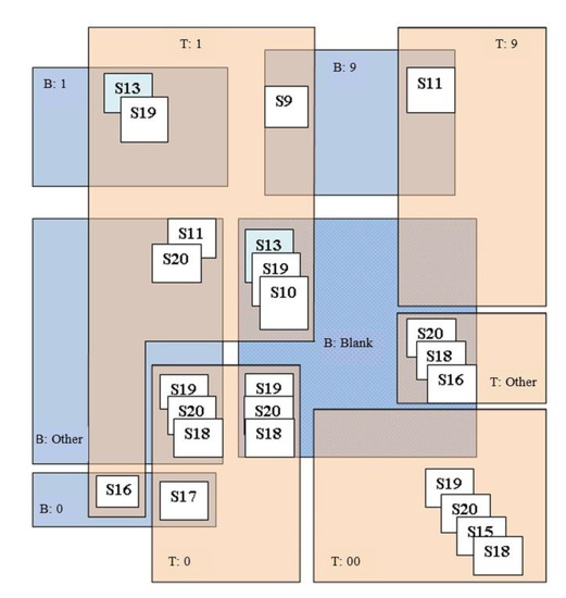 The ten subtractions that generated the highest number of errors reveal various issues. One cause that may have influenced student error is the structure of the subtractions in the questionnaire. The 17 subtractions that involved borrowing included the top 10 in terms of error rate. In addition to this, the subtractions S13, S11, S19 and S17 could be described as containing a column where the top and bottom include the same number (1 in some cases and 9 and 0 in others); in subtractions S19, S20, S15 and S18, there are various consecutive zeros on the top, and in subtractions S13, S19 and S10, there is a 1 on the top and a blank on the bottom, although the 1 is only affected by borrowing in S10. Subtraction S9 does not fit any of these structures, but as with some of the others, it involves the numbers 1 and 9 (1 over 9). Examining these structural peculiarities in more detail below, the 10 subtractions are organised in a chart that shows the relationship between the top and the bottom for all of them (T = Top, B = Bottom, S = Subtraction, Figure 3).