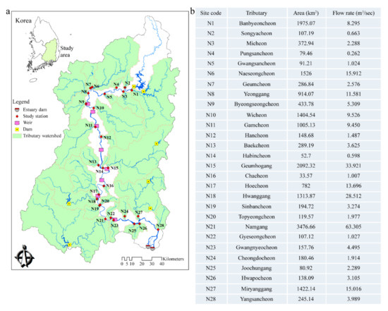 (a) Monitoring sites in Nakdong River tributaries and (b) physical characteristics.