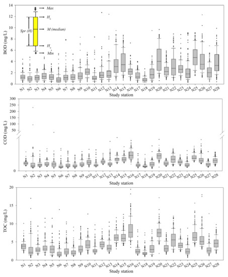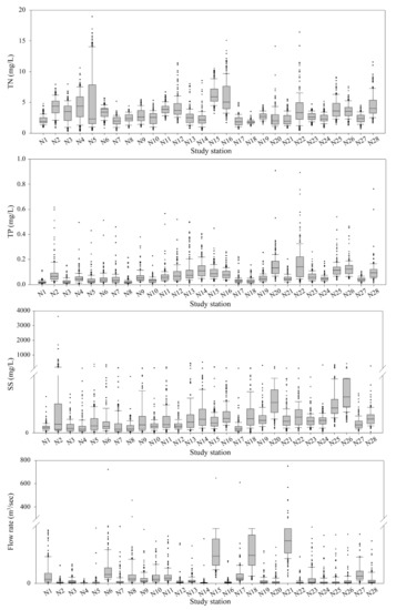 Variations in water quality at each of the 28 sites in the study area were analyzed for 11 water quality parameters surveyed from 2013 to 2017. Seven parameters, which consisted of the organic pollution indices BOD, COD, and TOC; the eutrophication indices TN and TP; the suspended solid index SS; and flow rate, were selected. The data of these seven parameters surveyed in 8-day intervals are displayed as box plots in Figure 2 and Figure 3, and the data summary is presented in Supplementary Materials (Tables S1 and S2).