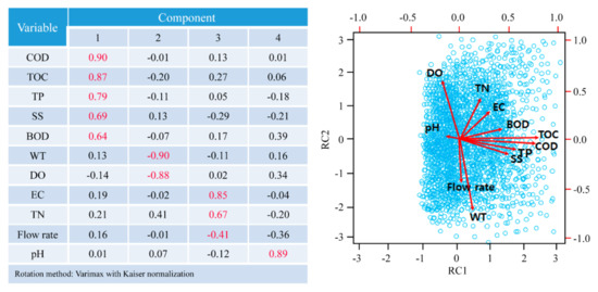 Principal component analysis and factor analysis were performed using monthly average values of the parameters at 28 monitoring sites. Four principal components with 1.0 or higher eigenvalue were extracted considering only the principal component axes. The first, second, third, and fourth factors contributed 40%, 23%, 20%, and 17%, respectively. The principal components from the first to the fourth factors accounted for almost all (100%) of the total variance. To verify whether the variables used for the descriptive statistics are suitable for factor analysis, the Kaiser–Meyer–Olkin (KMO) test was conducted. The KMO test measure was calculated as 0.63; it should be at least 0.5 to enable factor analysis. The spherical verification value of the Bartlett’s test was 0.000 (p < 0.05). Bartlett’s test verifies whether the variable used is a diagonal matrix. If the p value is less than 0.05, the diagonal matrix is rejected, meaning that factor analysis is possible. Therefore, both tests confirm that the correlations of the variables were statistically significant and the factor analysis was valid.