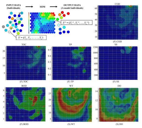 The analysis results are shown in Figure 4. COD, TOC, TP, SS, and BOD were classified as the first factor; WT and DO as the second factor; EC, TN, and flow rate as the third factor; and pH as the fourth factor. To investigate the correlations among the parameters classified as the first factor, pattern analysis was performed using SOM (Figure 5). For the number of output neurons in the two-dimensional grid for visualization, 4900 grids (N = 70 × 70) were used for horizontal and vertical directions. The results showed that the variables of the first factor showed a color pattern in the same direction (pattern) without opposite patterns, which is different from the pattern of the second factor. Based on the analysis results, the tributaries of the Nakdong River have the largest pollution levels caused by organic pollutants and nutrients, followed by the seasonal factor and the biological metabolism factor (Figure 4).