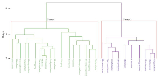 Dendrogram of 28 monitoring sites using hierarchical cluster analysis based on the water quality in the Nakdong River tributaries (Cluster 1: low pollution; Cluster 2: high pollution).