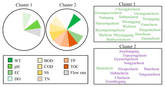 Geumhogang (N15) has a large impact on the Nakdong River because it experiences large environmental changes and flows through a large city. The tributaries classified in the same group, Chacheon (N16), Gyeseongcheon (N22), Habincheon (N14), Topyeongcheon (N20), Joochungang (N25), Yangsancheon (N28), and Hwapocheon (N26) also have high water pollution potential due to the watershed environmental characteristics. According to Singh et al. [38], cluster analysis results can be grouped by the water pollution level of the monitoring sites. Shrestha and Kazama [1] and Shen et al. [53] classified and reported the groups according to the characteristics of pollutants around the river and the impact of water pollution and urban sewage related to land use. In this study, the groups were classified by the characteristics of surrounding pollutants or the water pollution level of the stream. The results of the SOM analysis based on the recommended number of clusters are shown in Figure 7, which demonstrates the characteristics of the cells with the radar plots. Radars of different colors indicate different water quality factors. The classification of sites to cells (clusters) can be checked by the site name in each cell. The sites with water quality characteristics that have large effects of DO, pH, and flow rate were classified into Cluster 1, whereas the sites with water quality characteristics that have large effects of COD, TOC, BOD, TP, TN, SS, and WT were classified into Cluster 2. This cluster analysis method is useful for classifying streams with similar water quality characteristics and for distinguishing the effects of tributaries on the mainstream. Although cluster analysis is useful for classifying streams with similar characteristics based on the water quality management measures, it is difficult to prioritize the cluster analysis results within the same group.
