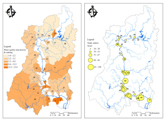Furthermore, these tributaries have high pollution load density and bad water quality, resulting in high scores. Thus, water environment management measures for these streams should be considered to improve the water quality of the Nakdong River mainstream. Hancheon (N12), Baekcheon (N13), Sinbancheon (N19), Songyacheon (N2), and Byeongseongcheon (N9) also have high water pollution potential, and thus attention should also be paid to the water quality management of these streams. Figure 8 illustrates the scores and rankings of the tributaries along with pollution intensities according to the pollution load density in each watershed for easy identification.