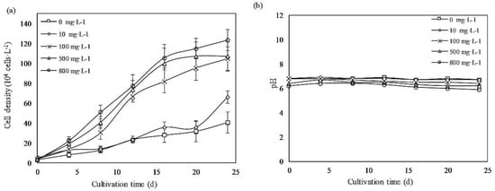 As shown in Figure 1b, the pH of the medium was almost stable within the range of 6–7, which was optimal for E. gracilis, during the culture period [20]. Table 1 summarizes the specific growth rate, DT, and biomass yield under different concentrations of PCA. When the PCA concentration was increased to 800 mg·L−1, the cell-specific growth rate and dry biomass yield reached a maximum of 0.23 d−1 and 1.32 g·L−1, respectively, significantly higher than those of the control group, of 0.14 d−1 and 0.43 g·L−1, respectively.