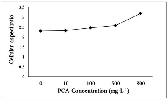 Cell morphology is an essential biological indicator of E. gracilis growth. It reflects the response of the microalga to environmental changes. E. gracilis cells exhibit various morphologies, such as spherical, spindle-shaped, and elongated forms, in response to different stimuli [35]. E. gracilis cells are spindle-shaped and motile in normal, favorable environments. However, the cells become spherical or cystic when exposed to unfavorable conditions [36]. The cell aspect ratio is calculated as the cell length divided by the cell width and indicates the shape of the alga cells. The median cell aspect ratio of the alga cultured under different concentrations of PCA in this research is shown in Figure 2. The cell aspect ratio increased with increasing PCA concentration. At PCA concentrations of 800 mg·L−1, the median cell aspect ratio increased from 2.31 to 3.18 times that of the control, and the cell aspect ratios of the alga treated with other PCA concentrations (10, 100, and 500 mg·L−1) were 2.33, 2.46, and 2.58, respectively. These results are within the range of values previously reported [37,38]. The increases in the aspect ratio with increasing PCA concentration was related to cell elongation, suggesting that PCA exposure provided a suitable environment for E. gracilis growth. The results of the cell morphology analysis are consistent with the promotion of growth.