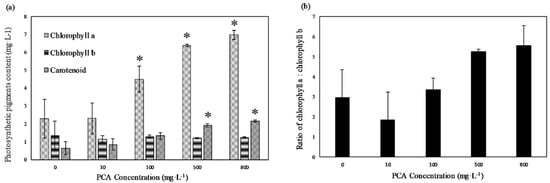 (a) Chlorophyll a, chlorophyll b, and carotenoids content of E. gracilis at different concentrations of PCA. (b) Ratio of chlorophyll a to chlorophyll b at different concentrations of PCA. Values represent the mean of three independent measurements (n = 3), and error bars indicate the standard deviation; * in each column indicates a significant difference, with p < 0.05, according to Student’s t-test.