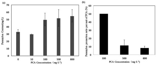 (a) Paramylon yield (mg·L−1) of E. gracilis culture under different concentrations of PCA. (b) Paramylon promotion ratio per unit of PCA (%·mg−1). Values represent the mean of three independent measurements (n = 3), and error bars indicate the standard deviation.