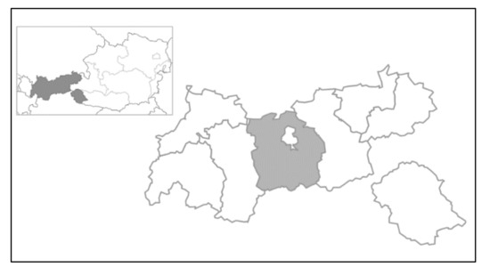 The political district Innsbruck-Land (large picture; grey) in Tyrol (small picture; grey), Austria (retrived from https://de.wikipedia.org/wiki/Datei:Karte_A_Tirol_IL.svg).