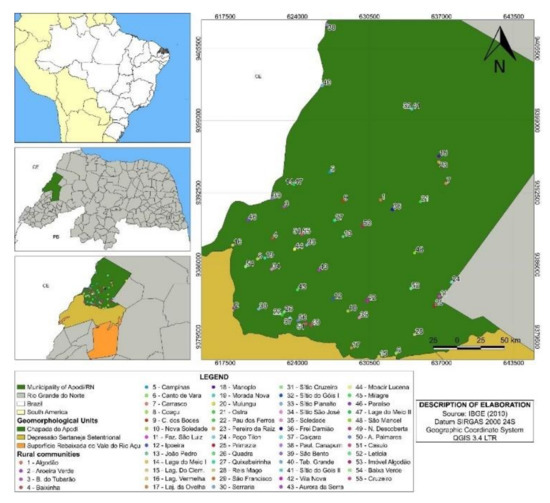 The study was carried out in Chapada do Apodi, located in Rio Grande do Norte, more specifically in the municipality of Apodi, which is located in the microregion of the Apodi plateau. The geomorphological unit called Chapada do Apodi concentrates 55 rural communities (Figure 1). It is approximately 340 km from Natal and 80 km from Mossoró, with a territorial area of 1,602,477 km2 and a population of 34,763 inhabitants, of which 17,531 live in urban areas and 17,232 in rural areas [30].