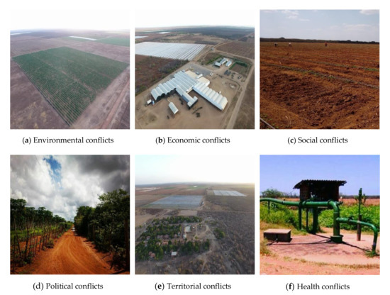 The conflict may derive from the dispute of the same resource base or different bases but connected by ecosystem interactions mediated by the atmosphere, soil, and, waters [42]. From this perspective, it is evident that Chapada do Apodi-RN is configured as a territory that is currently in transformation due to the expansion of agribusiness, which results in conflicts with local rural communities (Figure 3).