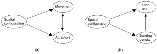 At present, there are two theories on how cities transform based on Space Syntax research, i.e., the theory of the natural movement economic process [17,18] and the theory of the natural urban transformation process [12]. The theory of the natural movement economic process states that the degree of the street and road network’s spatial integration affects patterns of movement, as well as the location of commercial activities such as shops and retail. The theory of the natural urban transformation process states that the degree of building density and land use diversity is also affected by the degree of the street and road network’s spatial integration. Figure 4 shows diagrams of these two theories, which are able to explain the relationship between cause and effect based on the spatial configuration of the street and road network [19]. The higher the degree of spatial integration of the street network, the higher the density of the built mass and degree of land use mixture. Measuring the degree of the street network’s spatial integration is done by applying the Space Syntax methodology.