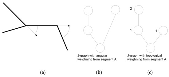 Figure 5a shows an example of four street segments and Figure 5b,c shows two different justified graphs. Both justified graphs show how street segment A relates to the other street segments B, C. and D. Figure 5a,b is redrawn from Turner [20], while Figure 5c is taken from van Nes and Yamu [21]. The graph in Figure 5b shows the degree of angular deviation, whereas the graph in Figure 5c shows only the number of direction changes from segment A to the other three street segments.
