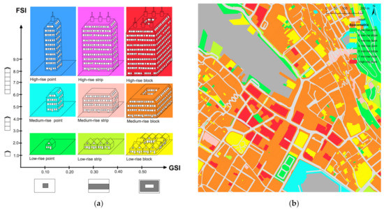 Depending on the number of floors, building density is categorised into low-rise, mid-rise, and high-rise density. The categories of building type are furthermore separated into point type, strip type, and block type, depending on the building’s form. Therefore, the entire built environment can be divided into nine categories, as described in Table 1.