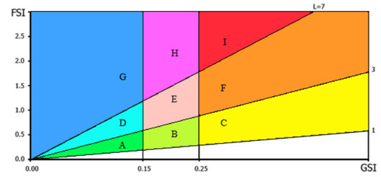 Figure 7 is adapted from Rådberg [7] and shows how different building types can be accurately and objectively categorised according to building intensity (FSI, on the y-axis), plot coverage (GSI, on the x-axis), and the total number of floors (L).