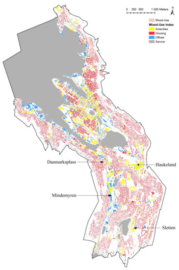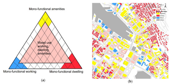 The weakness of this matrix is that the categorisation can be ambiguous. For example, a shop or a sports centre can be considered to be an amenity for the customers, whereas it is a workplace for the employees. As Dovey and Pavka also pointed out, a distinction between the level of attraction or the temporal distribution of activities was lacking [26] (p. 255). Improvements are needed to fine-tune this definition for the MXI method. Despite its shortcomings, however, the mixed land use index is a useful method for describing the degree of monofunctionality versus multifunctionality. Figure 8a is a ternary plot, a graphic depiction of the ratios of the three MXI variables as positions in an equilateral triangle. Monofunctional areas wind up at the edges of the triangle, whereas multifunctional areas are categorised in the middle of the triangle. Historical town or city centres tend to have a balanced mixture of dwellings, working places, and amenities; this is also the case in Bergen’s city centre. As can be seen in Figure 8b, there are various multifunctional buildings in the historic centre, as well as many amenities and workplaces. Conversely, many modernist urban areas tend to have a strict separation of functions, resulting in predominantly monofunctional areas.