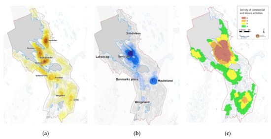 Three thematic maps that address functionality and density were juxtaposed with each other. Figure 9 shows housing density (Figure 9a), density of working activities (Figure 9b), and density of commercial and leisure activities such as trade, public and private service, culture, and education (Figure 9c). According to most writings on compact cities, a compact city has a high density of built mass, a high degree of land use diversity, a high number of services, and a high accessibility and frequency of public transport [28,29,30]. The maps of Figure 9 seem to confirm that the historical city centre is the most compact part within the study area, followed by Danmarksplass. These areas also have good public transport accessibility.