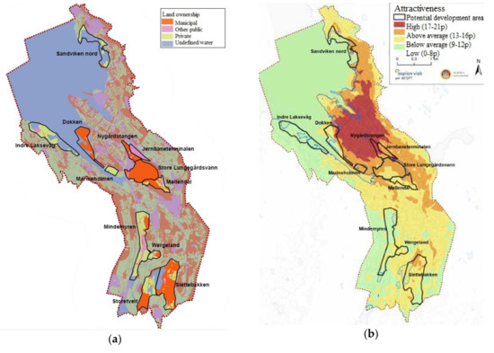 Figure 10. (a) Development areas overlapped on land ownership; (b) Summary map of attractiveness variables.