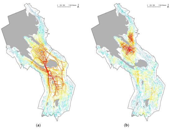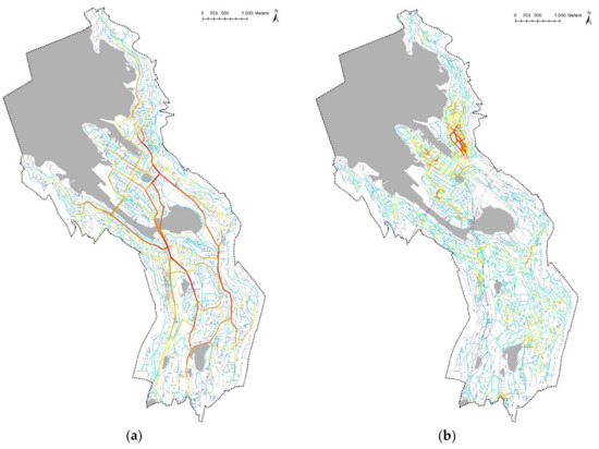 Figure 11. Space Syntax analyses of through-movement potentials. (a) Angular choice with high radius (R = 5000 m); (b) Angular choice with low radius (R = 500 m).