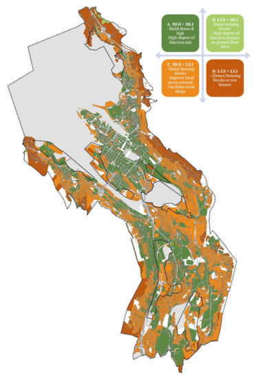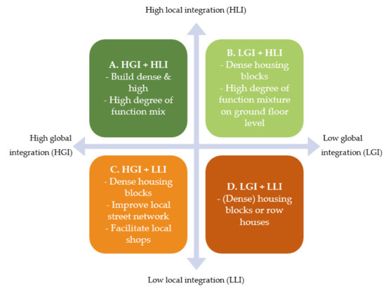 These correlations became useful for formulating recommendations to the Bergen municipality on where and how to densify. If the street network configuration influences how cities transform naturally, some long-term strategies can be made. Evidently, the street network configuration influences the degree of building density and degree of function mix [11,12]. Figure 15 shows how the following four types of densification strategies were identified based on street network integration on the local level (vertical axis) and citywide level (horizontal axis):