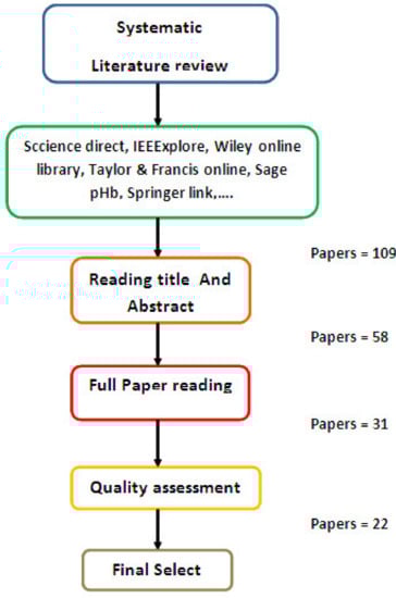 First, “Blockchain,” and “Industry 4.0” were chosen as keywords to search for articles (journal paper, conference, book chapter) published from 2018 to 2020 (recent works) collected from ScienceDirect, Emerald Insight, Wiley Online Library, Taylor & Francis Online, Sage Publications, IEEE Xplore and Springer Link. The research yielded 109 results, which indicates that Industry 4.0 and blockchain technology are emerging research topics. In the second step, these 109 articles were carefully reviewed, and inefficiently related articles were dropped (unclassified conference, unindexed journal, etc.). At the end, 58 documents were tabled. The 58 articles were then examined in depth, which led to 22 articles as a final selection.